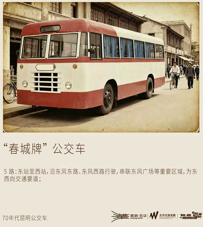 这三辆“移动的城市记忆”,每一辆都藏着老昆明的烟火气。60年代的“万国牌”2路车,曾穿梭于忠爱坊与云纺之间,载着工人师傅们开启工业时代的清晨;70年代的“春城牌”5路车,沿东风路这条五华区“主动脉”贯穿东西,见证了街头梧桐树的四季轮回;80年代的“凤凰牌”6路车,更是无数老昆明人的“出游伙伴”,载着欢声笑语驶向西山脚下。如今它们“重返”南屏街,变身为讲述五华故事的“移动博物馆”,一开门就引得市民争相打卡。